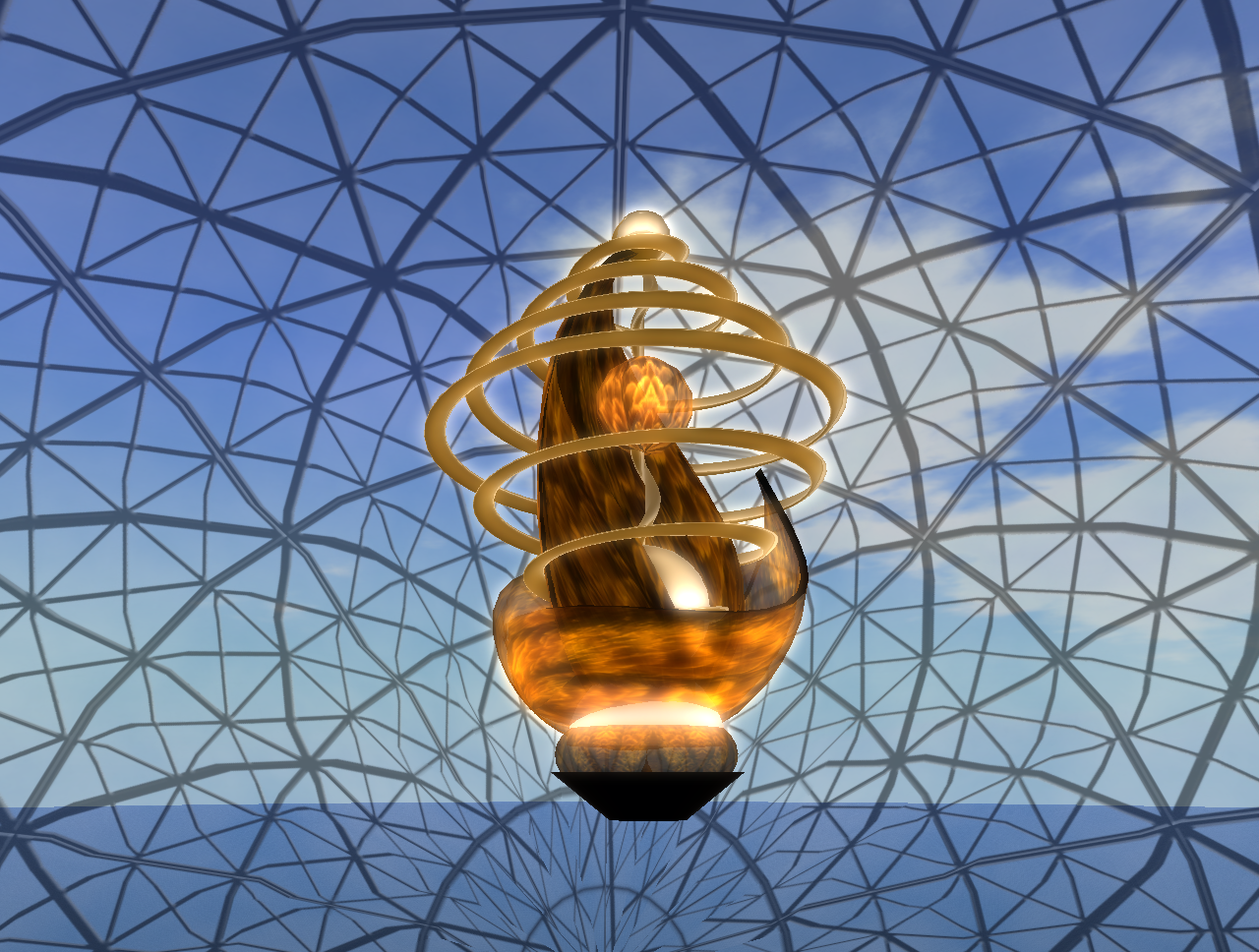 Lavitaloca Vita’s The Circle of Life is another intently participatory work. Again, the artist explicitly invites us to enter the piece, and we pass magically through the translucent shell of the world globe, to sit in the very centre of the work, amidst a circle of people of many ages and sizes. One feels that these individuals may be not only male and female, child and adult, but also drawn from a variety of ethnic backgrounds. The viewer has a real sense of internationality when seated in the midst of the piece, and the work could readily be adopted by an agency of the United Nations as symbolic of its endeavours. The use of colour and texture to facilitate the play of light within the enclosing shell, and the musical dimension, together with the lotus-postion meditative pose of the viewer (or viewers, as the piece can accommodate several people simultaneously) all combine to create a sense of peace and well-being as well as hope for the future of the human race. The mysterious shimmering spiral in the very centre I have no clear sense about, and welcome enlightenment, but whatever it means to you as the viewer is valid for you. The only thing that comes to my own mind is a representation of DNA as binding humanity together as a continuing species.