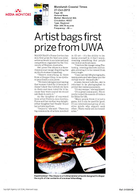 The human form is present and active in some of the works displayed, and I have chosen to write about three of these. Kyra Roxan’s Urban Girls could be set in my home town of Perth, but probably is not since the artist is American and was partly educated in Spain. Some shimmering night-time cityscape forms a backdrop to the sensual image of three shapely female friends seen from the rear, embracing and apparently anticipating their planned outing into the urban jungle for a night of entertainment and, probably, seduction. The female form is credibly Latina, and the colouring also, the hair and flimsy minimalist clothing adorning bodies presented in bas relief which are appreciated all the more fully from seeing the work side-on as well as conventionally from the front. The human shapes and adornments clearly owe much to the way Second Life represents these things, but this is to take nothing from the work, which draws the viewer in and makes the female viewer wish she could be a fourth member of the party, and the male viewer no doubt already planning how to discover the nightclub where he may encounter these girls in perhaps an hour’s time, to offer to buy one of them a drink and draw her aside from her friends.