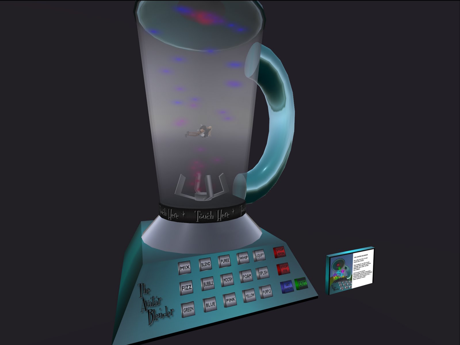 "Thanks and hugs to Josina and Velazquez at CARP for this award. I'm delighted that The Avatar Blender was chosen for its humor. I love creating work that is fun, entertaining, interactive and hopefully will bring a smile and some laughter. I'd also like to thank Jayjay and Freewee for hosting and curating the UWA challenge series. And last but not least, a very big thank you to Georg Janick (Gary Zabel) who is not only a great friend, but for several years has graciously shared the Caerleon sims to provide artists with a place to experiment, learn, share knowledge, exhibit works, collaborate and play. Georg's involvement with art in Second Life is significant and many artists in Second Life have benefited from his generosity and support in addition to the thousands of Second Life residents who have enjoyed numerous exhibitions featuring dozens of amazing works of art by both well established and novice artists alike." Pixels Sideways