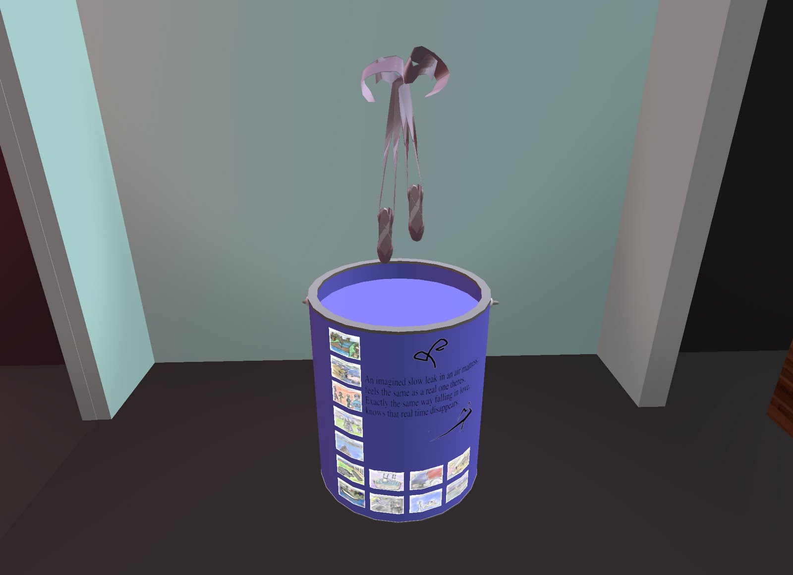 RETIRED BALLET SHOES SUSPENDED OVER A CAN OF BLUE PAINT by Earl Dinkin